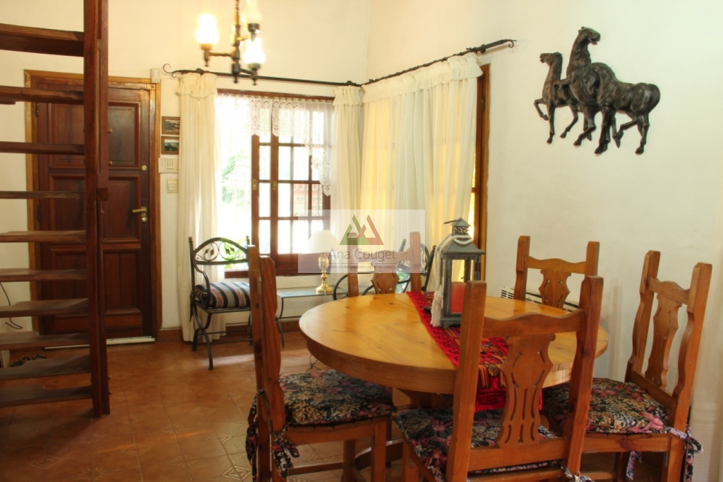 Muy linda casa en muy buena ubicaciòn cerca de la entrada a Carilo. Living comedor con hogar, mesa para 6 personas, todo en muy buen estado, cocina, dos dormitorios con baño completo en el medio, placards, escalera a pequeño ambiente con espacio para dos camitas o escritorio de trabajo. Muy lindo jardìn, garage pasante que puede ser galerìa con parrilla, pileta exterior en la parte del fondo, lavadero, y un espacio de guardado con puertas.